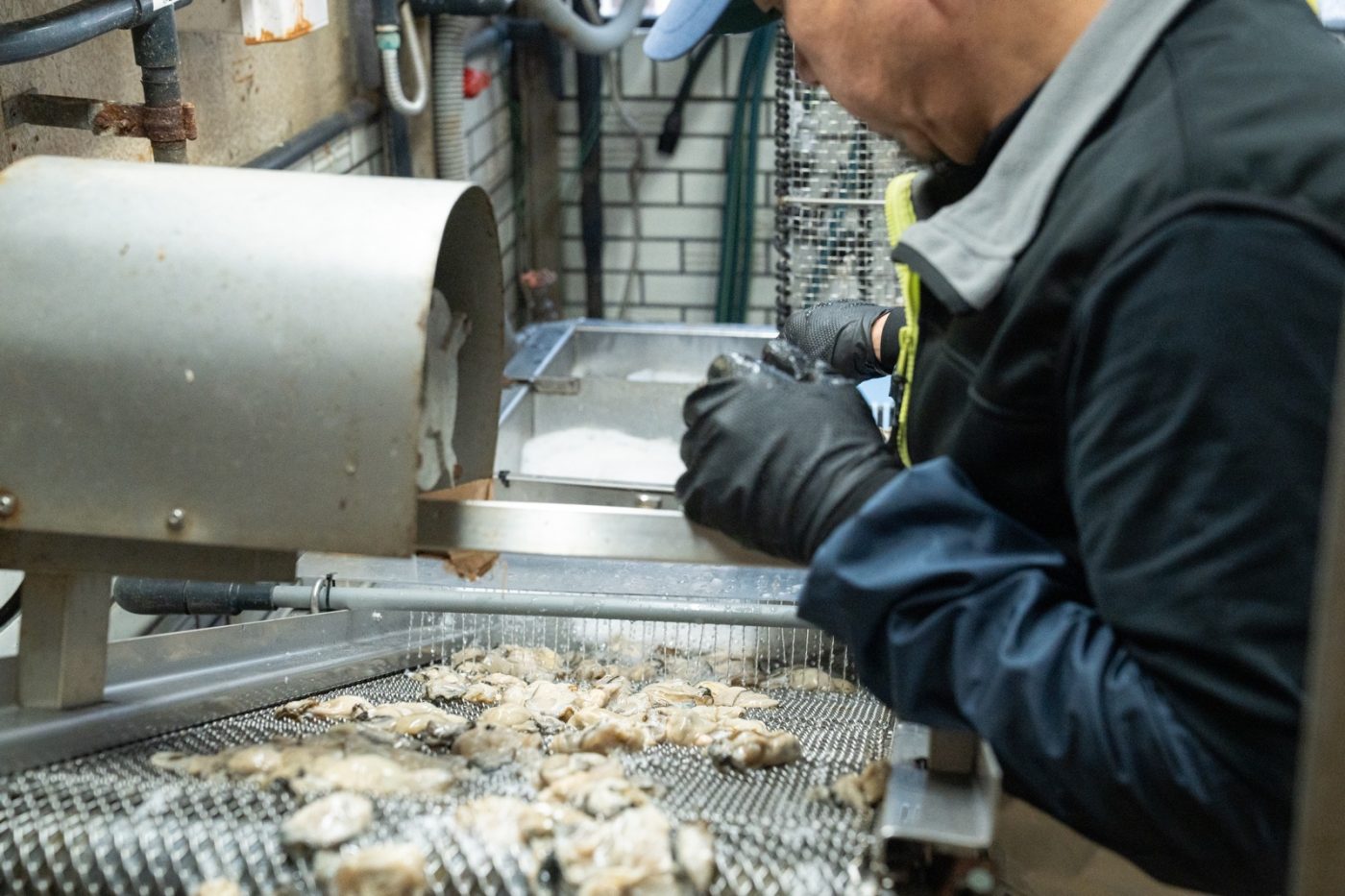 山口水産では、一番身入りの良い牡蠣棚がある場所から毎朝水揚げした牡蠣を剥いています。徹底した温度管理と、最適な塩分濃度で管理しています。