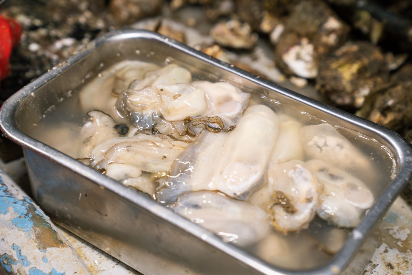 その後、牡蠣にとって最適な塩分濃度の人工塩水に入れて冷却することで、余分な水分を出して、身の締まった牡蠣をご提供しております。