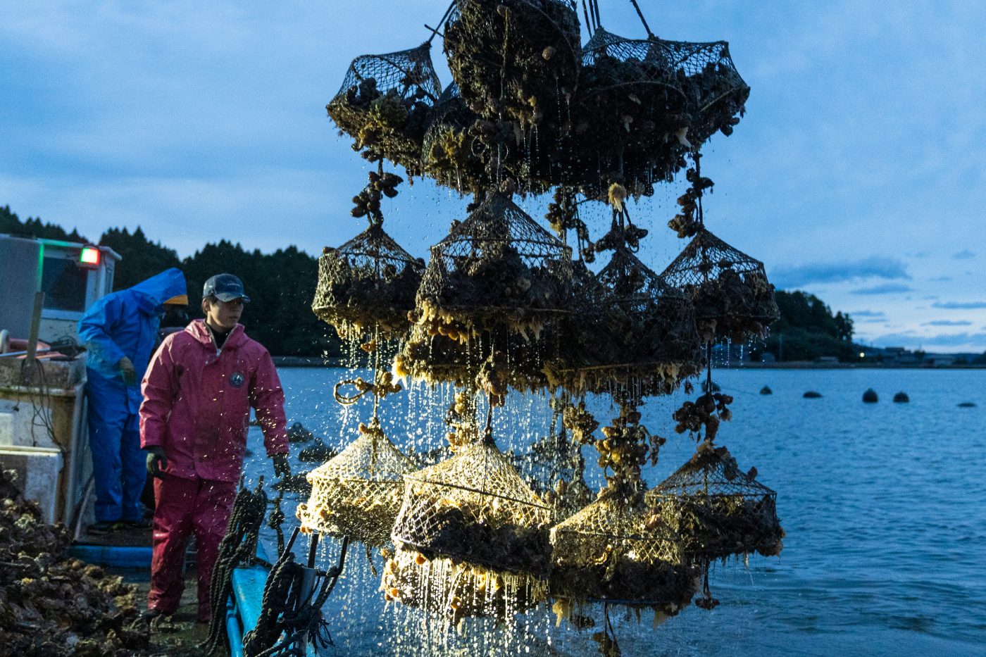 牡蠣の殻に付着物(フジツボ等)を取り除き、ネットに入れて再度海へ。
