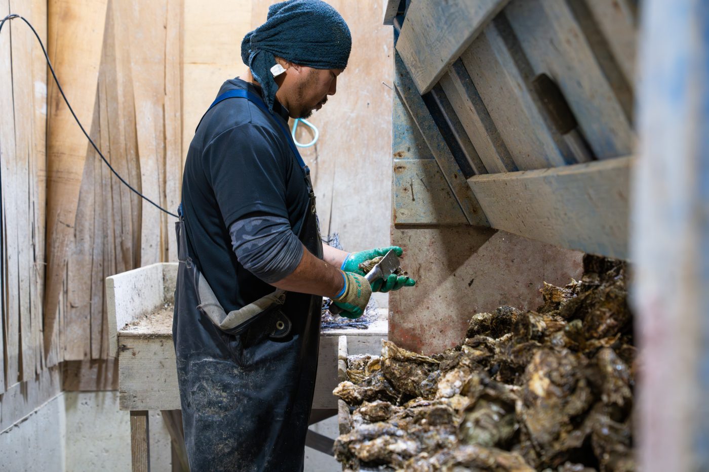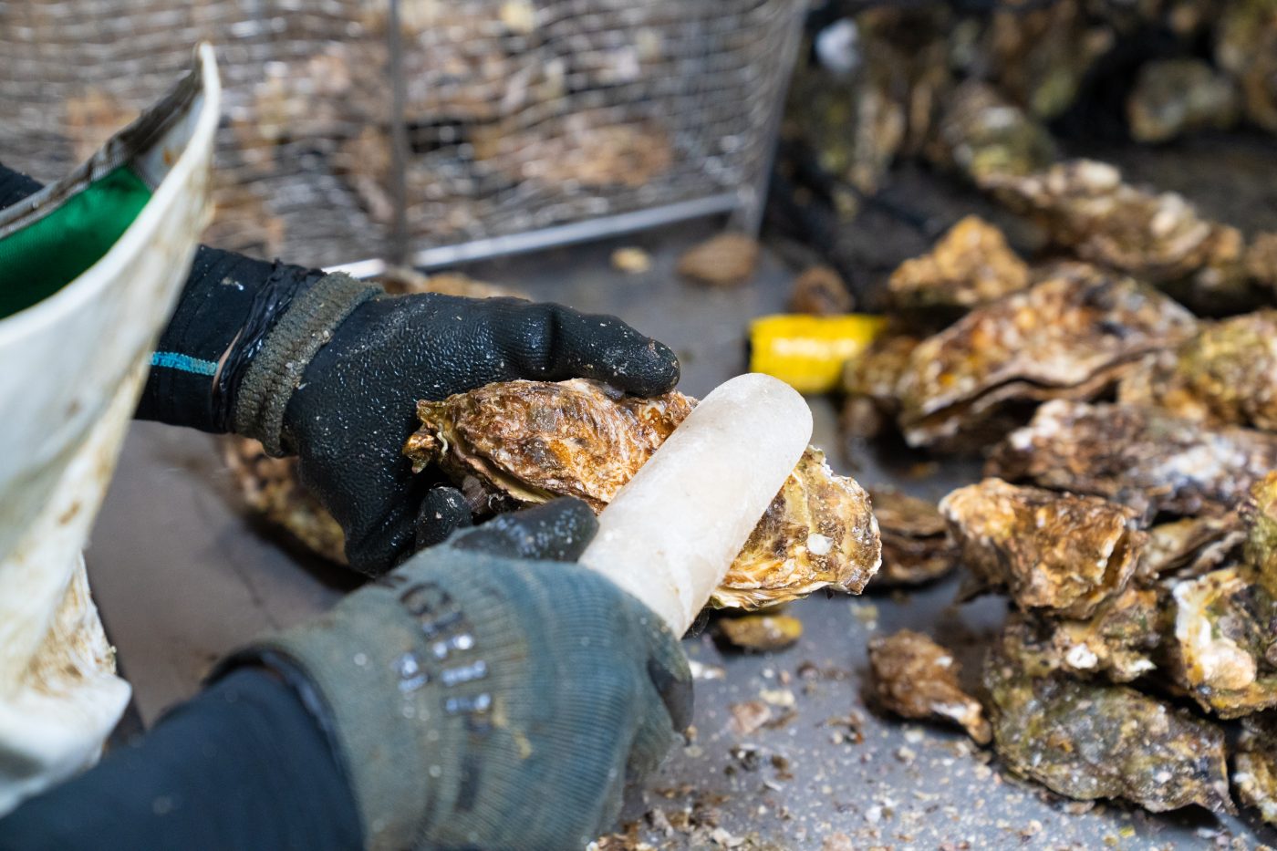 まず、水揚げした塊になった牡蠣を、一つ一つナタでより分けて、