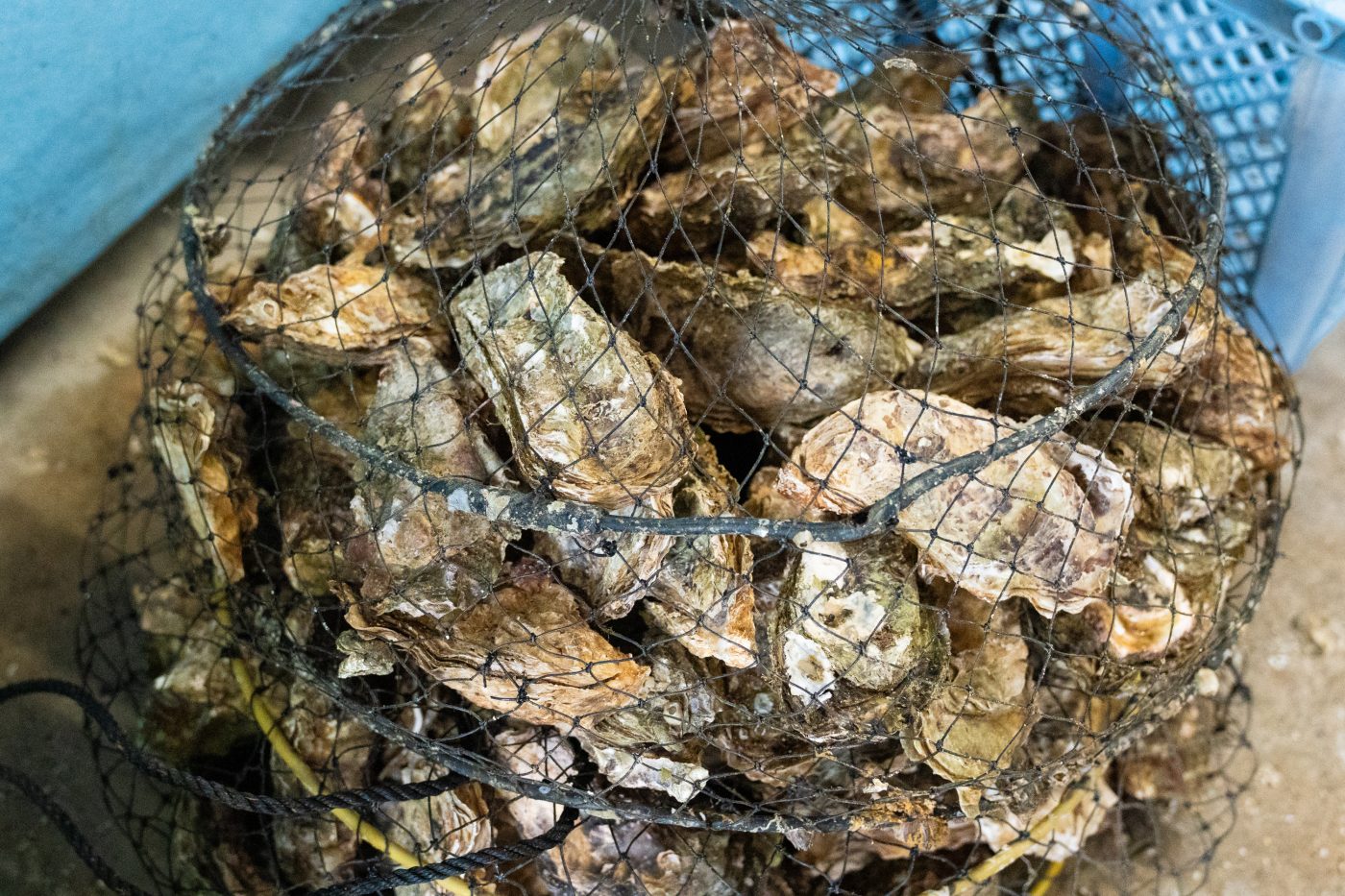 再度ネットに入った牡蠣を水揚げし、一つ一つ牡蠣の表面に就いた付着物を、きれいに取り除きます。